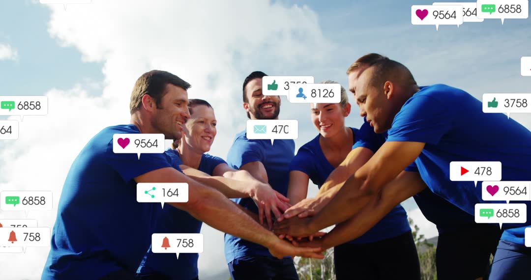 A successful marketing team celebrating increasing digital engagement metrics using animated icons. Members stack their hands symbolizing unity and teamwork, high in spirit outdoors. Perfect for illustrating concepts of successful collaboration, enhancing team spirit, digital success stories, or marketing campaign achievements.