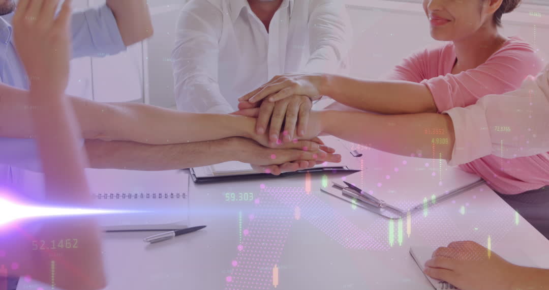 Hands stacked together represents unity and collaboration in an office setting enhanced by a digital overlay of financial graphs. This conveys modern business success synergizing teamwork and technology. Suitable for depicting business innovation, financial growth, and collaborative dynamics in corporate or motivational content.