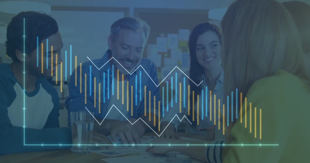 This dynamic scene portrays a business team engaged in collaborative discussion during a meeting. Overlayed graphs highlight data analysis, conveying a focus on statistics or projections. This content is suited to illustrating corporate teamwork and strategic planning, and can be used in business presentations, websites about business services, and articles covering team dynamics and strategic development.