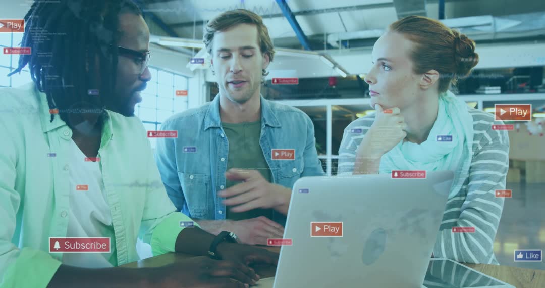 Coworkers are collaborating around a laptop in a contemporary office environment while discussing digital marketing strategies. Floating icons for Play, Subscribe, and Like suggest their engagement with social media. Ideal for illustrating topics related to digital collaboration, modern workspaces, online marketing projects, and the importance of social media interaction in business.