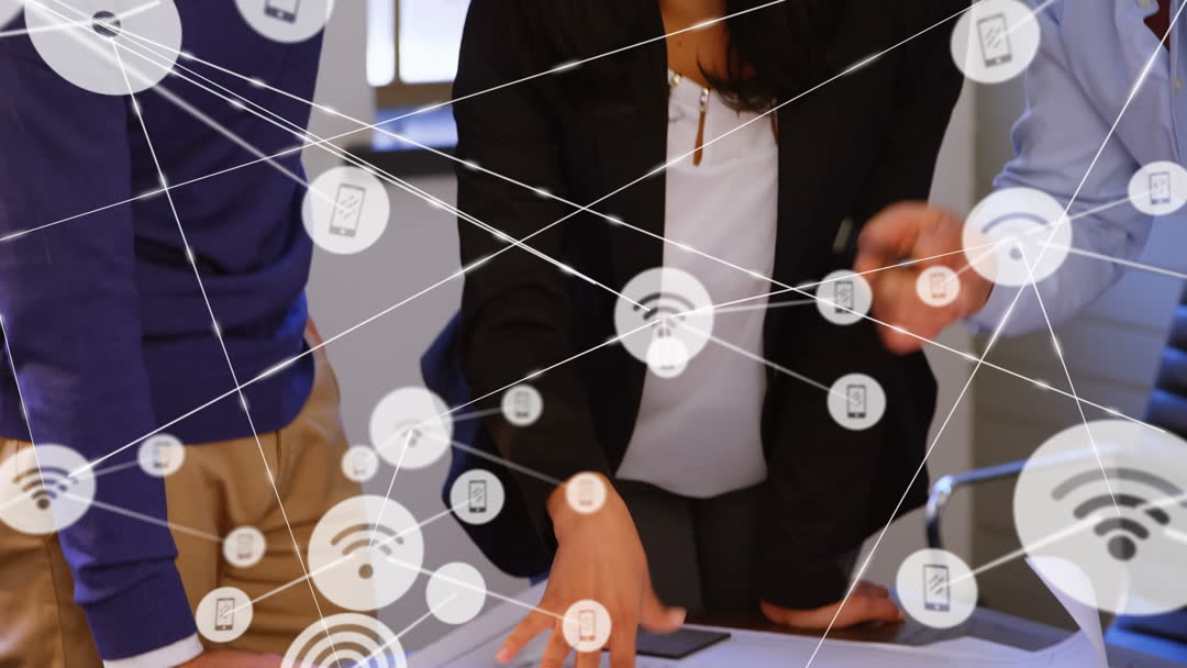 - Team Collaborating on Architecture Plans with Wi-Fi and Mobile Connect Icons