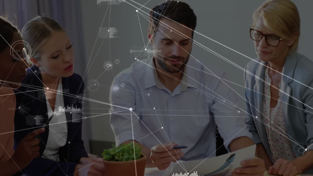 Video showing team collaborating over business documents while digital analytics overlay and network graphics intersect across frame. Professionals pointing with pen and checking smartphone while reviewing brochure and discussing strategy. Composition blending human interaction with augmented data visualizations conveying tech-driven decision making and connected workflows. Suitable for corporate presentation openers, consulting firm websites, startup pitch videos, marketing campaigns, training modules, and investor outreach. Use as hero footage for business landing pages, background for webinars, slide deck intro for analytics topics, or editorial content about digital transformation and teamwork.