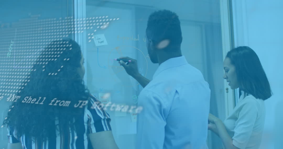 A diverse team collaborates in an office, working together on financial analysis. A member is drawing on a transparent board, and two colleagues are engaged in discussion. Digital graphics showcasing financial data overlap the video, symbolizing data-driven strategies. This visual could be used for content about team collaboration, modern business environments, or financial services marketing.