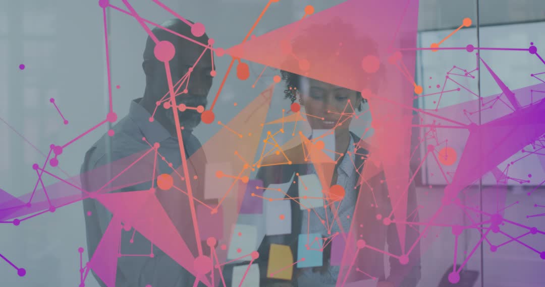 Two professionals work together, attaching notes to a glass wall for a business plan while vibrant digital patterns suggest expanding networks. Perfect for illustrating modern collaboration, innovative teamwork, and data-driven insights within an office environment. Suitable for use in business presentations, articles on innovation, or networking campaigns.