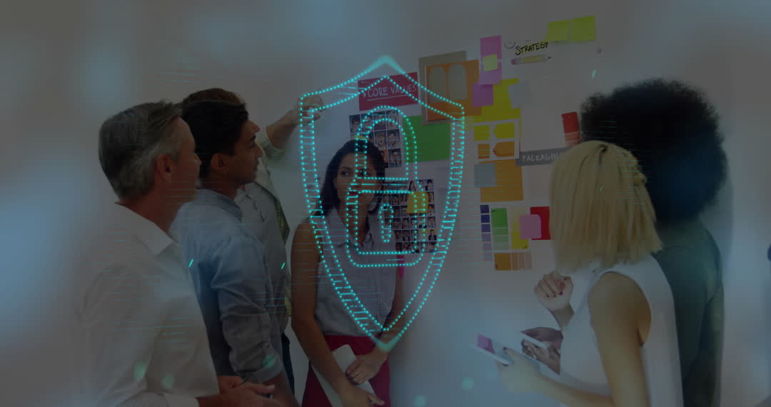 Team Collaborating on Strategy with Digital Security Overlay Video