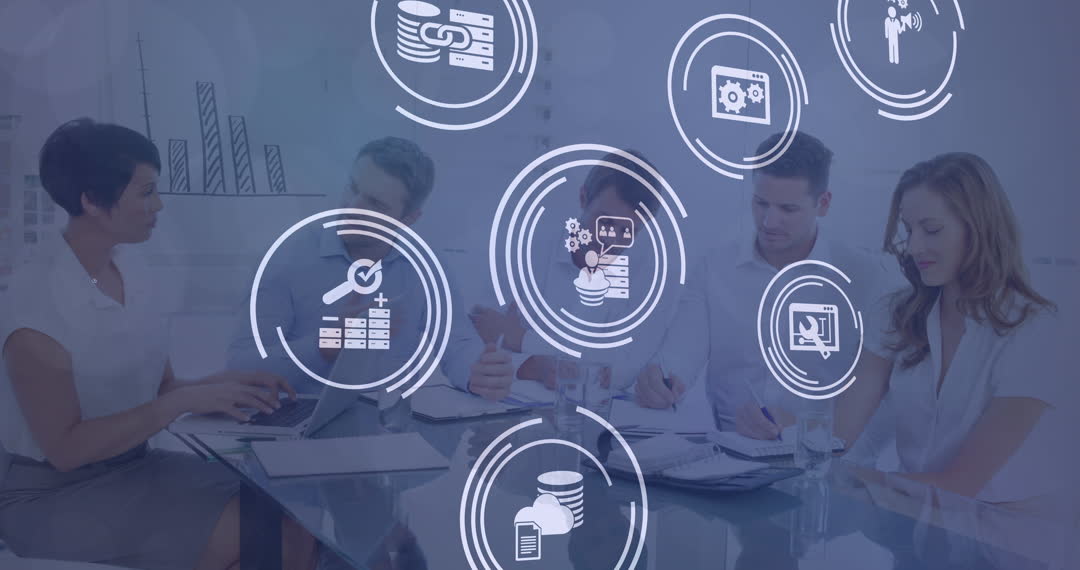 Colleagues engaged in a brainstorming session, integrating digital technology icons overlays, representing collaboration on innovative technology and networking solutions. Useful for showcasing corporate teamwork, digital innovation, and business development in contemporary work environments.