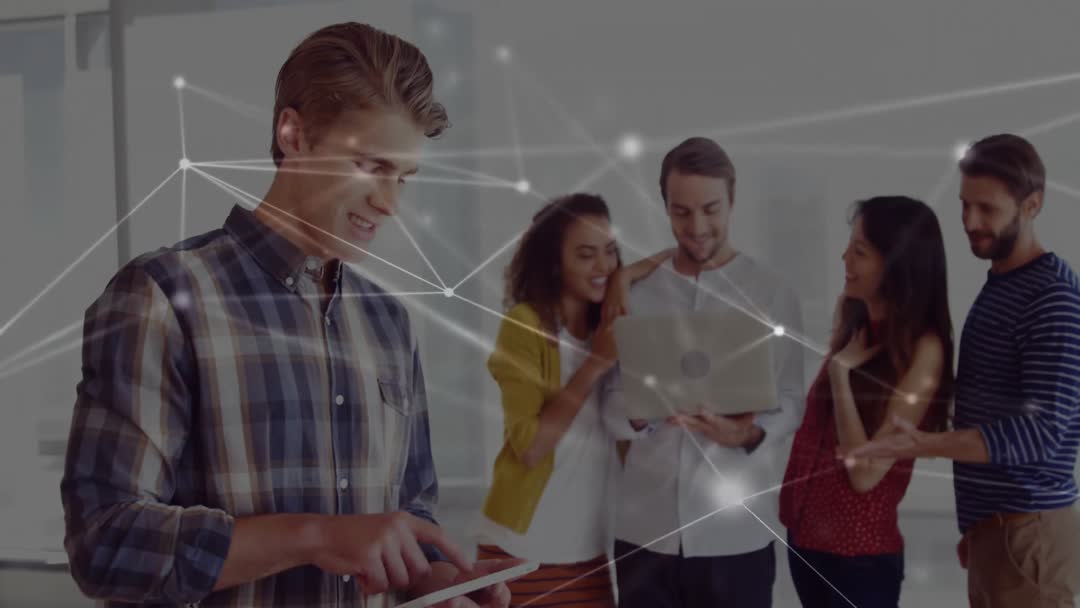 Team Collaborating with Digital Network Overlay in Office Video