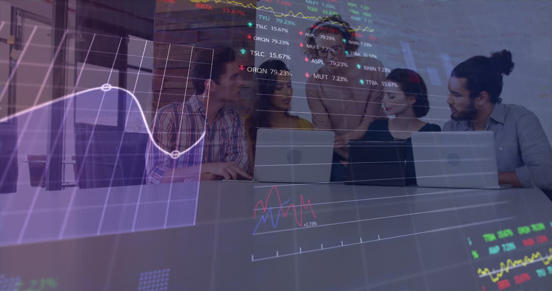 - Team Collaborating with Digital Stock Market Overlay in Modern Office