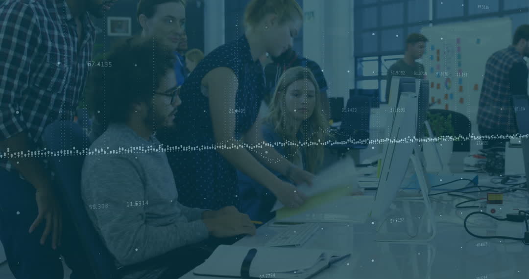 Business professionals collaborating around computer with overlaid digital financial data and projections. Useful for conveying themes of teamwork, data analysis, technology integration, and modern business practices. Ideal for corporate presentations, financial reports, or technology blogs.
