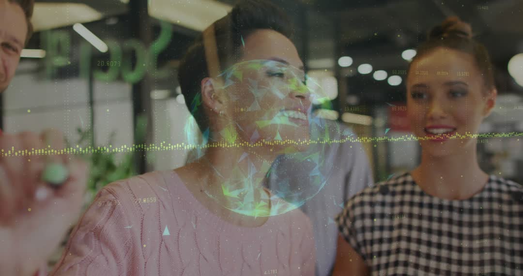 This scene captures professionals collaborating in an innovative workspace, projecting and interacting with a virtual 3D globe paired with waveforms. The team demonstrates modern technology and collaboration in data visualization and design. Useful for illustrating themes of teamwork, cutting-edge technology, and digital innovation in corporate or educational presentations.