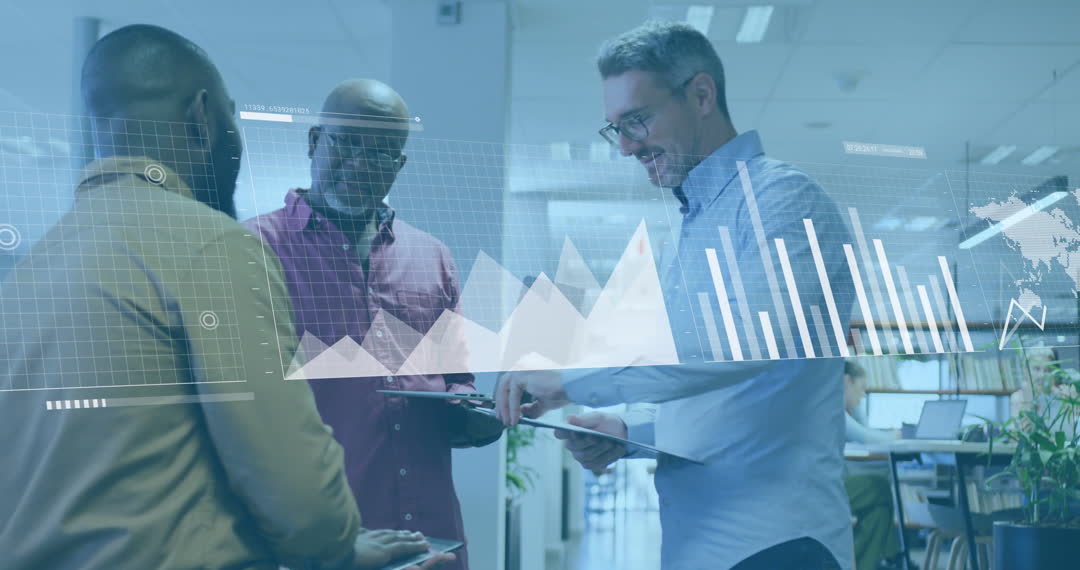 Diverse coworkers collaborate and share ideas in a modern office, overlaid with animated graphs. Useful for illustrating concepts of teamwork, data analysis, and progressive business discussions in corporate settings, highlighting technology integration in decision making.