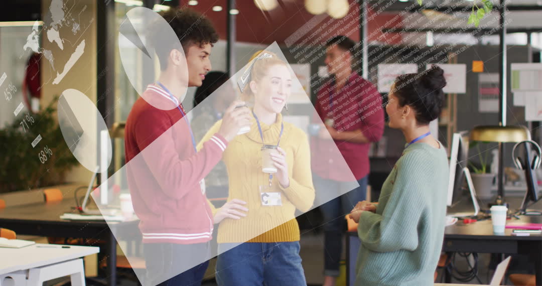 Three diverse colleagues enjoy coffee while discussing in a modern office environment enriched with digital elements such as graphs and programming language overlays. Perfect for representing themes of teamwork, modern technological business practices, office culture, strategic planning, and team interactions in competitive and coordinated corporate settings.