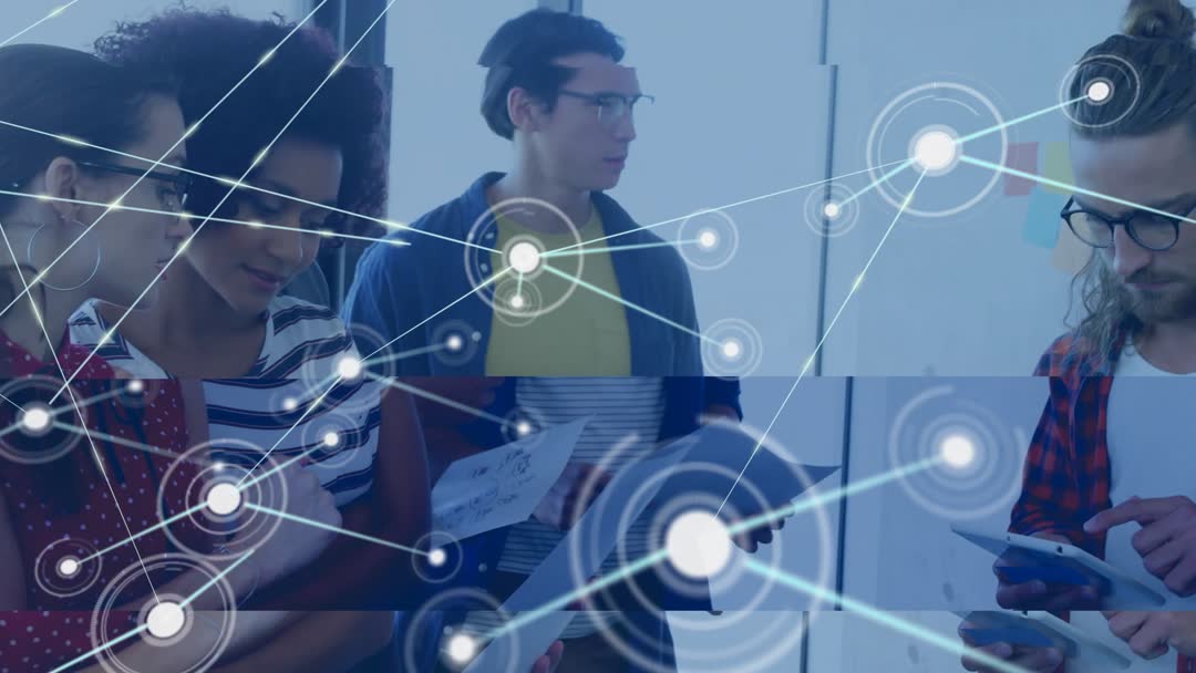 Video of four colleagues collaborating in a modern office environment. They examine work sheets while engaging with digital technology, represented through a dynamic graphic network overlay connecting ideas and people. Perfect for presentations on teamwork, modern business practices, innovative work strategies, or digital networking themes.