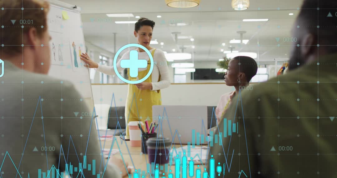 In an office environment, a woman in bright yellow overalls points to a flipchart while engaged in an innovative business presentation. Health symbol overlays add a digital and analytical layer, emphasizing teamwork and data analysis. Male coworkers actively listen, indicating collaboration and strategic planning. Ideal for use in business websites, corporate presentations, digital strategy campaigns, and materials that highlight professional collaboration and innovation.