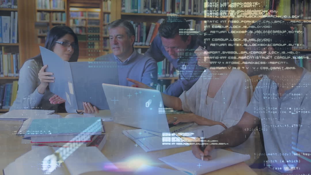 Diverse team collaborating in library setting with overlay of coded data, showcasing integration of traditional studies with modern technology. Ideal for educational service advertisements, tech-gadget commercial promotions, or illustrating teamwork and modern analyses in report presentations.