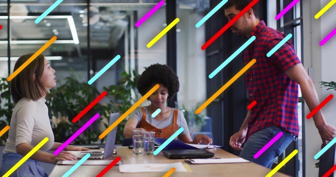 Video captures professionals collaborating on project details around shared table in airy, plant-filled office. Bright, curved graphics indicate creativity, technological engagement. Useful for billboard on fitted clothing line about workplace productivity goals or illustrating business teamwork case study.