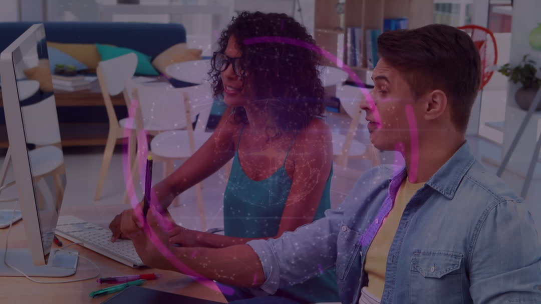 Depicts a man and woman collaborating on a computer in an office with a conceptual network overlay. Ideal for articles or materials related to business innovation, teamwork, technology-driven solutions, and diversity in workplace settings.