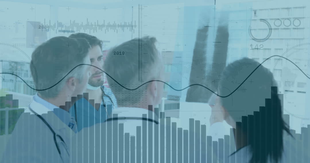 Group of diverse professionals engaging with a digital overlay of financial graphs and charts during a business meeting. Useful for illustrating themes of corporate decision-making, strategy development, and teamwork in financial or technology presentations.