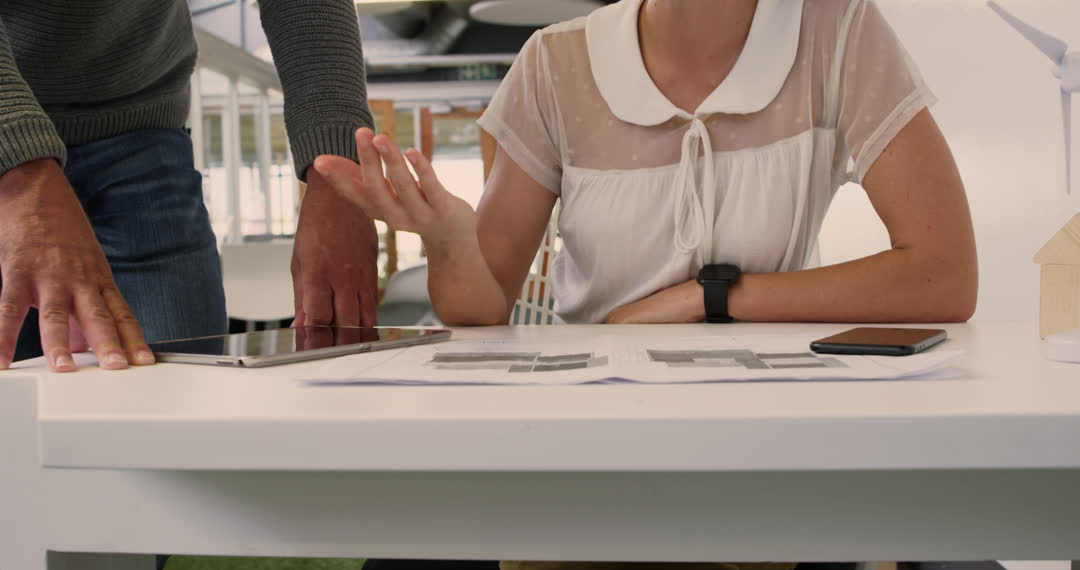 Mid section view shows two business professionals engaged in discussion, indicating teamwork and collaboration in a modern office. Documents and electronic devices on table suggest strategic planning or project review. Ideal for concepts related to corporate teamwork, office dynamics, or professional environments.
