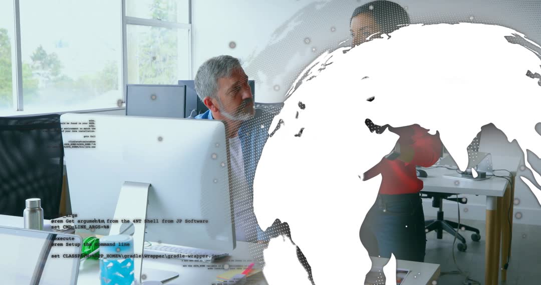 Dynamic office environment highlights a project lead engaged in code review next to team members. A digital globe overlay emphasizes theme of global connectivity and modern technological communication. Suitable for concepts in business innovation, team collaboration, and international technology solutions. Useful in presentations, corporate settings, and network communication illustrations.