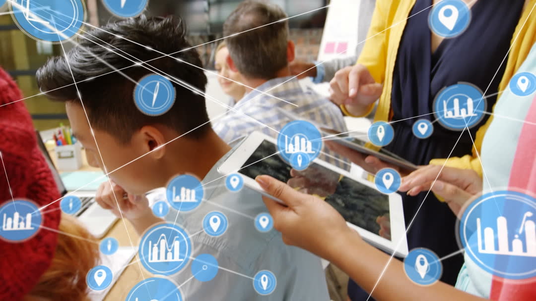 Animated depiction of digital icons overlaying individuals using a tablet in an office environment. One woman is engaged with a digital tablet, suggesting ways teams use technology for connectivity and collaboration. Ideal for illustrating themes of modern business, innovative solutions, and teamwork in technology-focused enterprises.