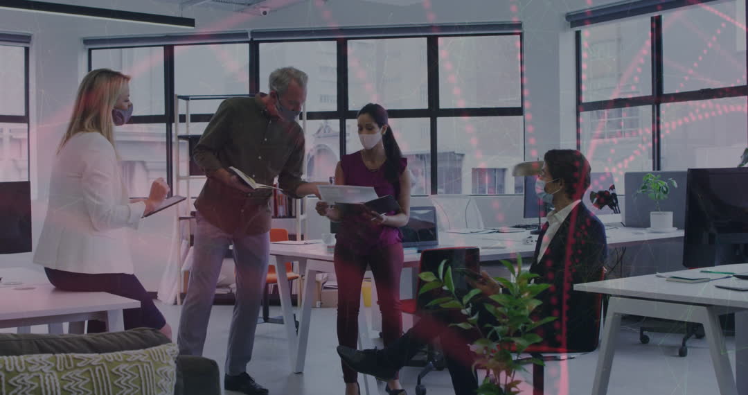 This scene captures a diverse group of business people collaborating in a modern office setting while wearing face masks. Overlaid with data circuits, the video emphasizes technological connectivity and digital transformation in a Covid-aware workspace. Ideal for use in illustrating discussions on modern workplace adaptations, teamwork in recent technological advancements, and maintaining safe communication during a pandemic.
