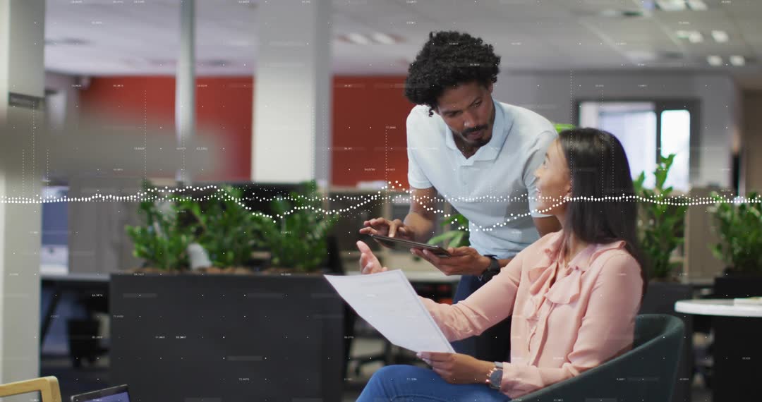 Video captures teamwork in action as a woman reviews a printed document while engaging with a colleague holding a tablet in an open office setting. Animated digital data overlaid on the scene symbolizes enhanced data analysis and efficient communication. Ideal for illustrating modern business environments, promoting teamwork and use of digital tools in presentations, articles, and promotional materials about office productivity and collaboration.