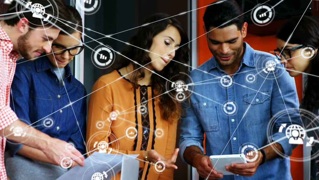 Group of diverse professionals engaging in collaborative discussion, visually enhanced with digital network icons indicating connectedness and technology integration in a business context. Ideal for topics about team collaboration, digital transformation in business, modern technology in the workplace, and innovative work environments.