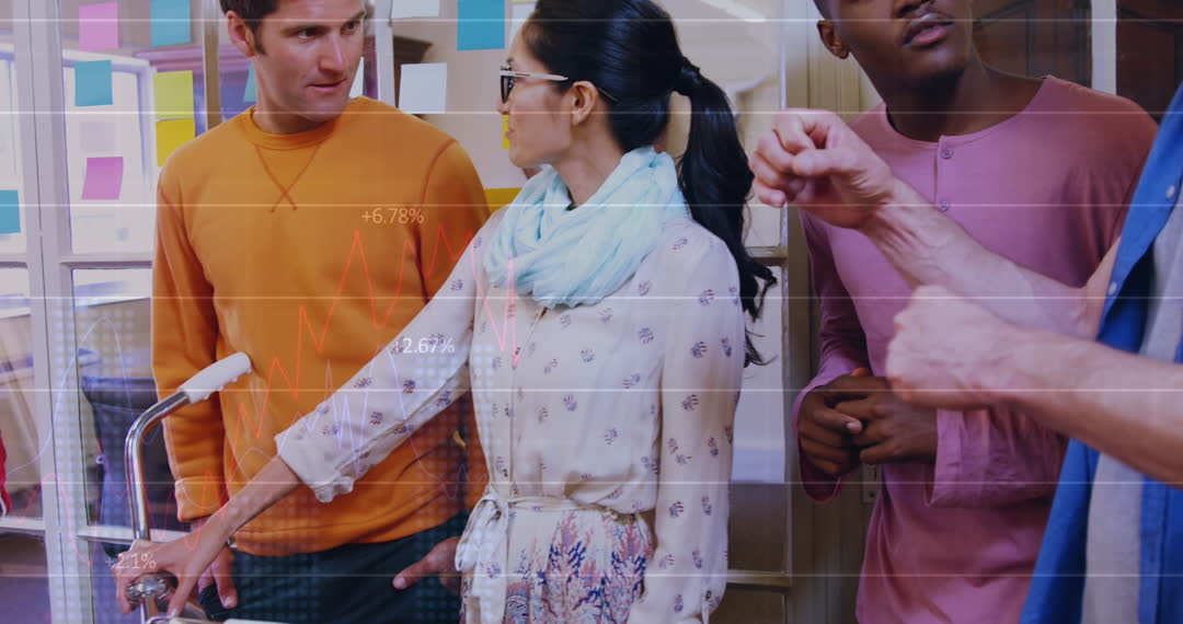 Young professionals collaborating with a digital overlay featuring financial graphs, suggestive of data-driven discussions in a modern workspace. Useful for illustrating teamwork and innovation in business contexts or promoting financial analysis tools.