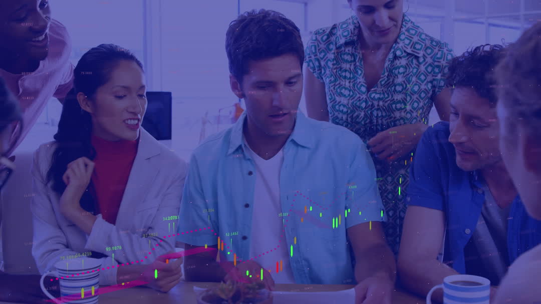 Group of diverse coworkers collaborating on a financial presentation with digital interface graphs overlaid. Image captures the mix of teamwork and technology in a business environment. Useful for showcasing innovation, corporate teamwork, analytics dashboards, or financial presentations.