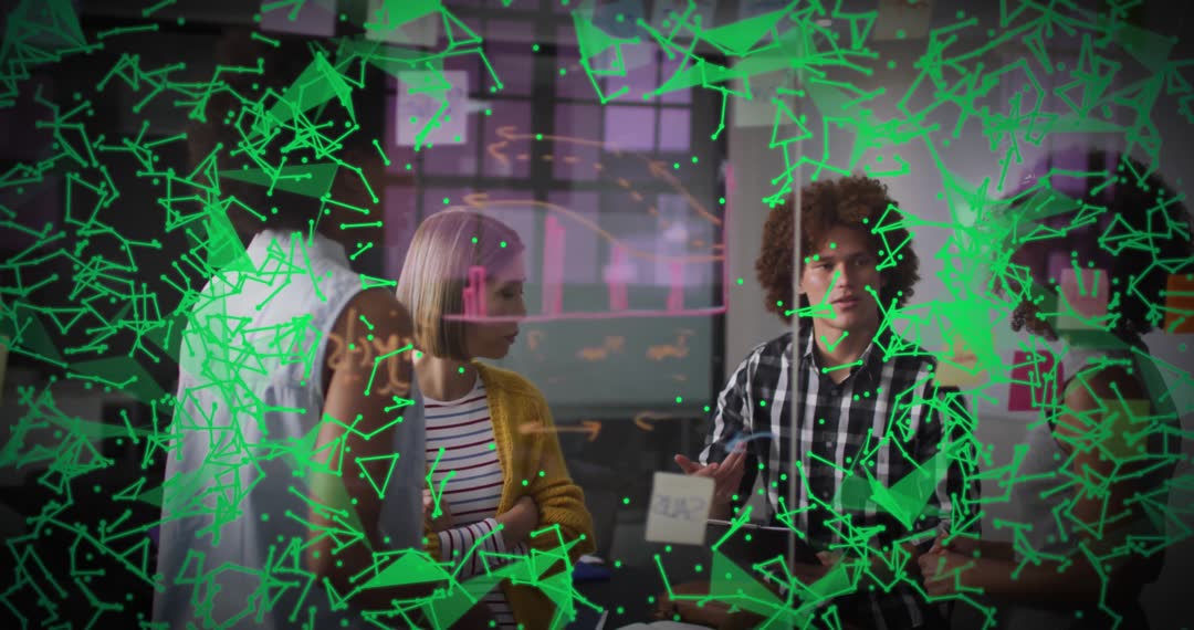 Business professionals engaging in collaborative discussion layered with digital green network effects. Useful for illustrating modern workplace environments, digital integration, team problem-solving, and innovative business meeting concepts. Helps convey ideas of connectivity and technological advancement in promotional materials.