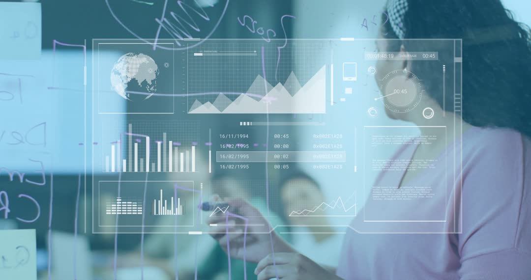 The video shows a team leader marking on a transparent board, overlaying with futuristic holographic data charts. The scene highlights modern teamwork featuring digital interfaces, emphasizing innovation and collaboration in corporate settings. Ideal for content about technology-driven work environments, promoting future-forward strategies, and showcasing data-driven decision-making.
