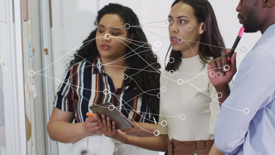 Diverse professionals gathered in office environment with abstract networking overlay visible. Individuals appear focused and engaged, suggesting a discussion of strategic business decisions or plan development. Idea-rich setting useful for content on collaboration, network technologies, and team efficiency in modern workplaces.