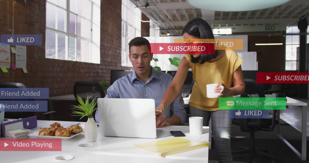 Diverse coworkers interacting over a laptop in a contemporary office environment, surrounded by social media notification overlays. Brings together elements of teamwork, digital engagement, and modern workplace technology. Ideal for themes related to business productivity, digital collaboration, modern communication tools, and multitasking in professional settings.