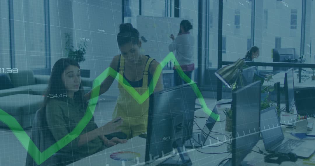 Young professionals involved in data analysis in modern office environment. Colleagues reviewing statistics represented by evolving graph overlay on workspaces. Suitable for illustrating concepts related to business metrics, analytics, teamwork, and digital transformation. Ideal for business presentations, articles exploring modern office dynamics, and marketing materials focused on professional productivity.