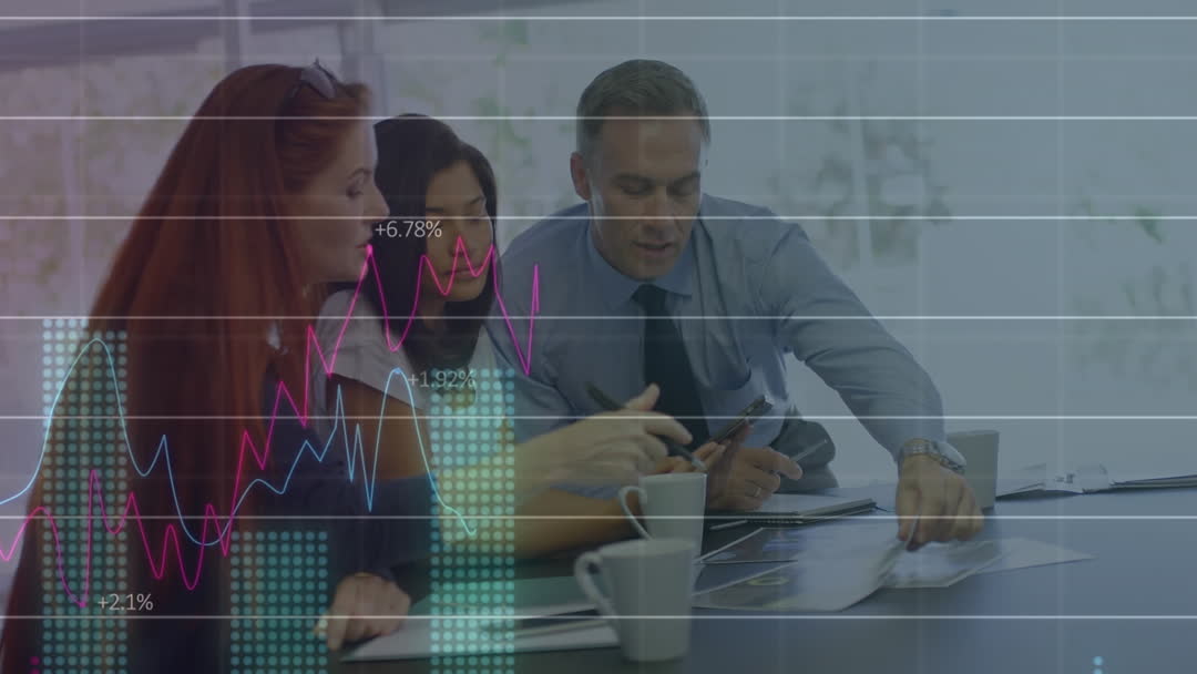 Colleagues engage in an insightful discussion about business strategies, enhanced by statistics overlay animation that adds a dynamic element to the visual narrative. Useful for illustrating modern business meetings, teamwork in diverse settings, and data-driven decision-making in presentations or company communications.
