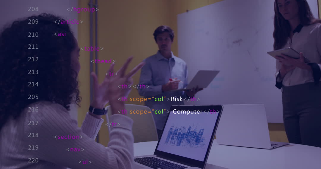 Group of business professionals discussing data insights using laptops in a modern office setting. Overlay shows data code reflecting a digital and tech-driven environment. Perfect for illustrating teamwork in tech-based businesses or presentations on data-driven decision-making in diverse working environments.