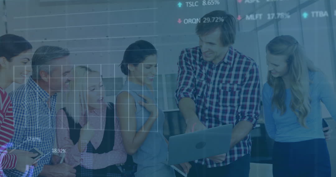 Business professionals collaborate while reviewing digital financial data superimposed over the scene. This content is ideal for depicting themes of modern finance, team collaboration, data analysis, and the integration of technology in corporate environments—perfect for use in materials related to business innovation, financial consultations, and corporate strategy planning.