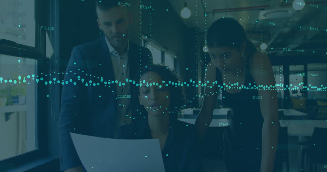 Business professionals collaborate around a desk, engaging with a document while a digital graph animation overlays the scene. Blue data points demonstrate stock trends and market fluctuations, representing global economic concepts. Ideal for topics on financial analysis, market strategies, teamwork, and modern business environments, this video supports discussions in finance or data-driven sectors.