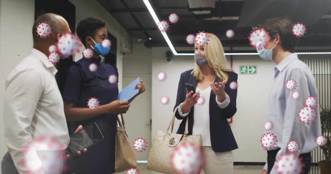 Visual depicting a group of four people in office discussing during pandemic. They are wearing protective face masks and holding electronic devices. Abstract virus particles overlay adds context of health awareness or informational theme. Suitable for presentations on workplace safety, pandemic measures implementation, health communication strategies, teamwork in current global landscape.