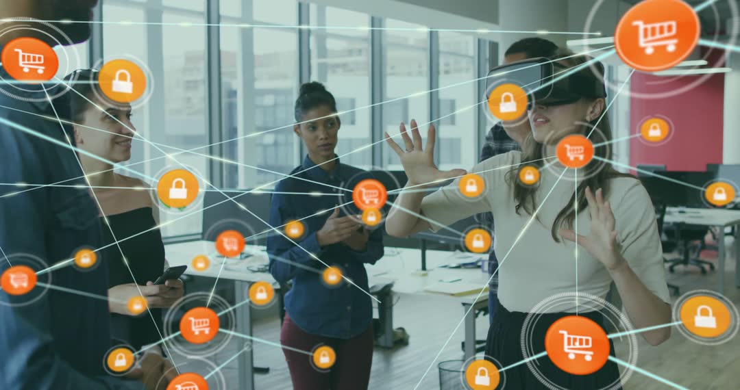 This scene captures a business team collaborating and exploring augmented reality interfaces in a modern office environment. Security and shopping cart icons are visualized as AR elements, representing connections in online commerce. Useful for illustrating themes of technological innovation in business, advancements in digital retail, and team collaboration in modern corporate settings. Ideal for articles or marketing materials related to AR in business, ecommerce strategies, or corporate teamwork.