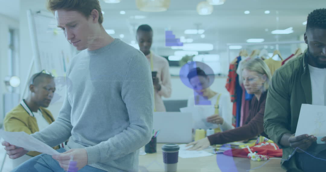 Business professionals go through documents as integrated digital data interfaces surround them in a vibrant office. This composition reflects teamwork, diversity, and modern company dynamics, suitable for conveying ideas related to digital transformation and collaborative work settings. Useful for promoting innovation, showcasing team-driven projects, and illustrating contemporary business processes.