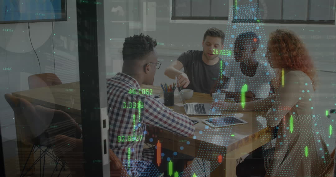 Group of diverse colleagues discussing financial data overlayed with digital charts. Useful for themes on modern business, finance technology, teamwork in professional settings, or global business analysis.