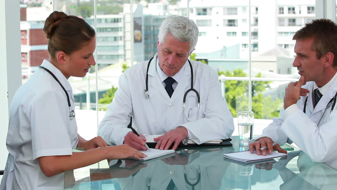 A group of doctors, consisting of an older man and a younger man and woman, are seated around a glass table engaged in intensive discussion. The scene suggests collaboration and decision-making at a hospital or clinic setting. This can be used in contexts related to healthcare teamwork, training, professional development, and medical decision-making.