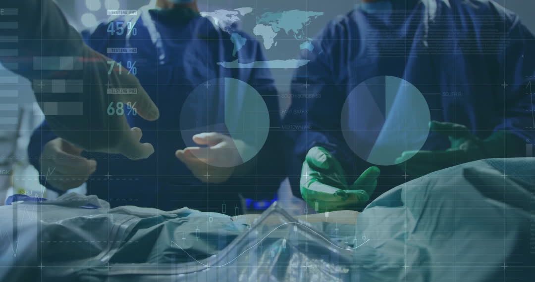 Digital overlay with graphs indicates combination of medical expertise and technological advancements. Useful for illustrating themes of modern healthcare, medical finance implications, and digital integration in hospitals. Ideal for use in articles or presentations about advancements in surgery technology and healthcare management.