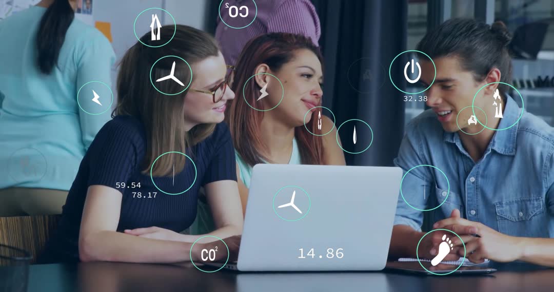 Young professionals gathered around laptop, tracking green metrics decisions through floating digital icons. Suitable for illustrating teamwork, data-driven decision-making in modern business environments, and innovation through collaboration.