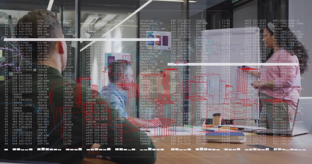 Video clip showing team presenting augmented analytics overlay in modern office meeting. Presenter drawing bar chart on flipchart while red wireframe of 3D city-style data models and scrolling code overlay emphasizing data-driven strategy. Colleagues nodding, taking notes, discussing insights around conference table with laptops, notebooks and takeaway coffee. Fitting for corporate presentations, executive briefings, training modules, product demos, website hero banners, investor pitches and marketing campaigns focusing on analytics, AI or digital transformation. Clip useful for illustrating teamwork, collaborative decision making, KPI review, forecasting and business intelligence storytelling.