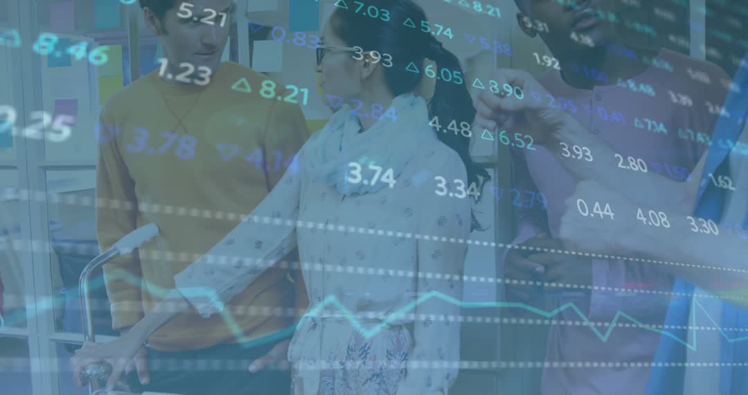 The frame shows a group of individuals collaborating around a prototype scooter, with digital data overlay indicating financial or performance metrics. A person in blue is gesturing, likely explaining or analyzing the prototype's specifications. This image can be used to represent themes such as innovation, collaborative working environments, or synergy between design and technology. Suitable for content about product development, tech collaboration, startup environments, or ergonomic design strategies.