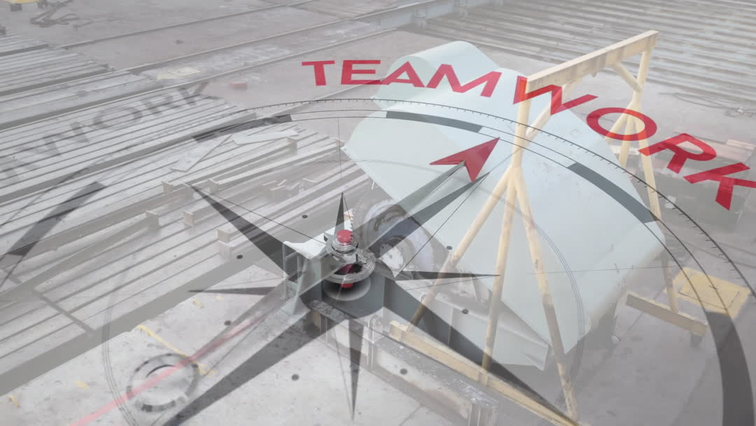 Visual blends compass videory with industrial machinery to emphasize teamwork and direction in an industrial context. Suitable for promoting organizational goals, illustrating teamwork in manufacturing settings, emphasizing communication and collaboration in industrial environments, and supporting educational material on teamwork.