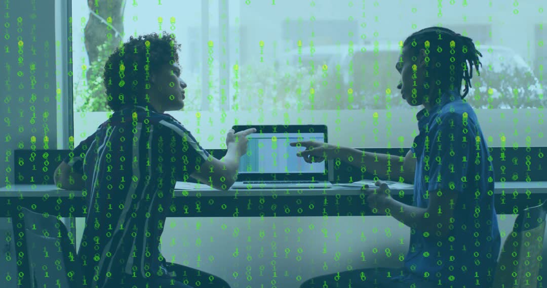 Two professionals sitting indoors at a desk focusing on laptop conversation. Visible stream binary code layers signifying tech data review process. Useful for illustrating concept technology collaboration, analyzing software methods or highlighting modern office communication strategies.